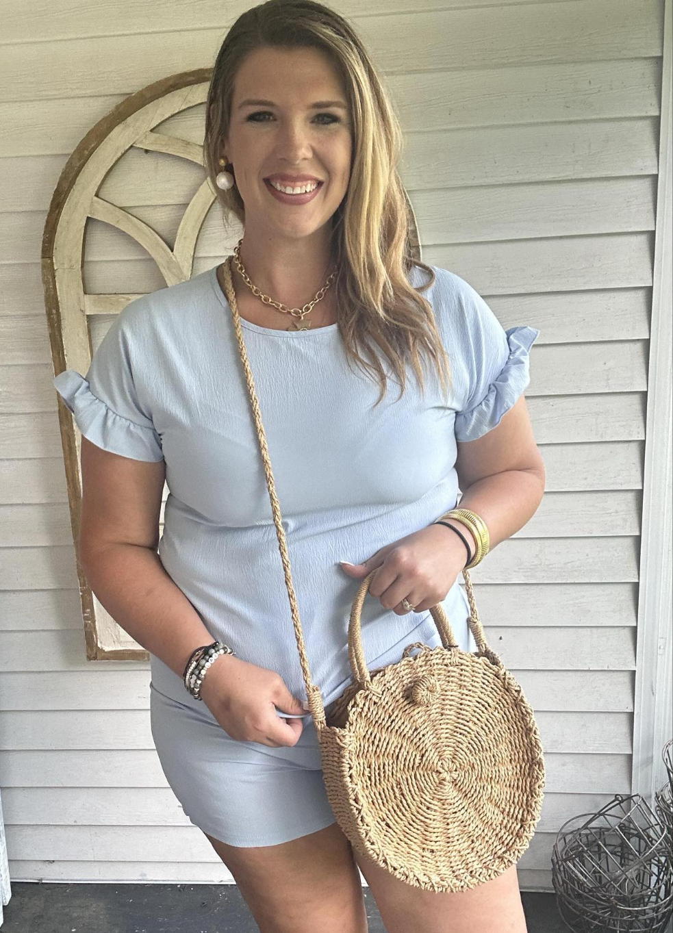 Linen two-piece short set with ruffle sleeve in light blue.