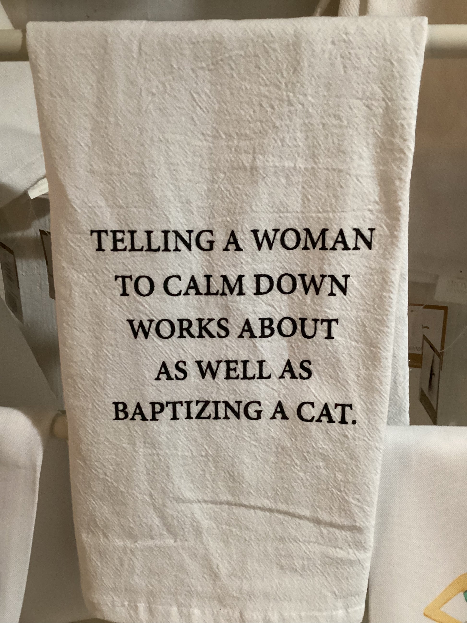 White flour sack tea towel that reads "Telling a woman to calm down works about as well as baptizing a cat."