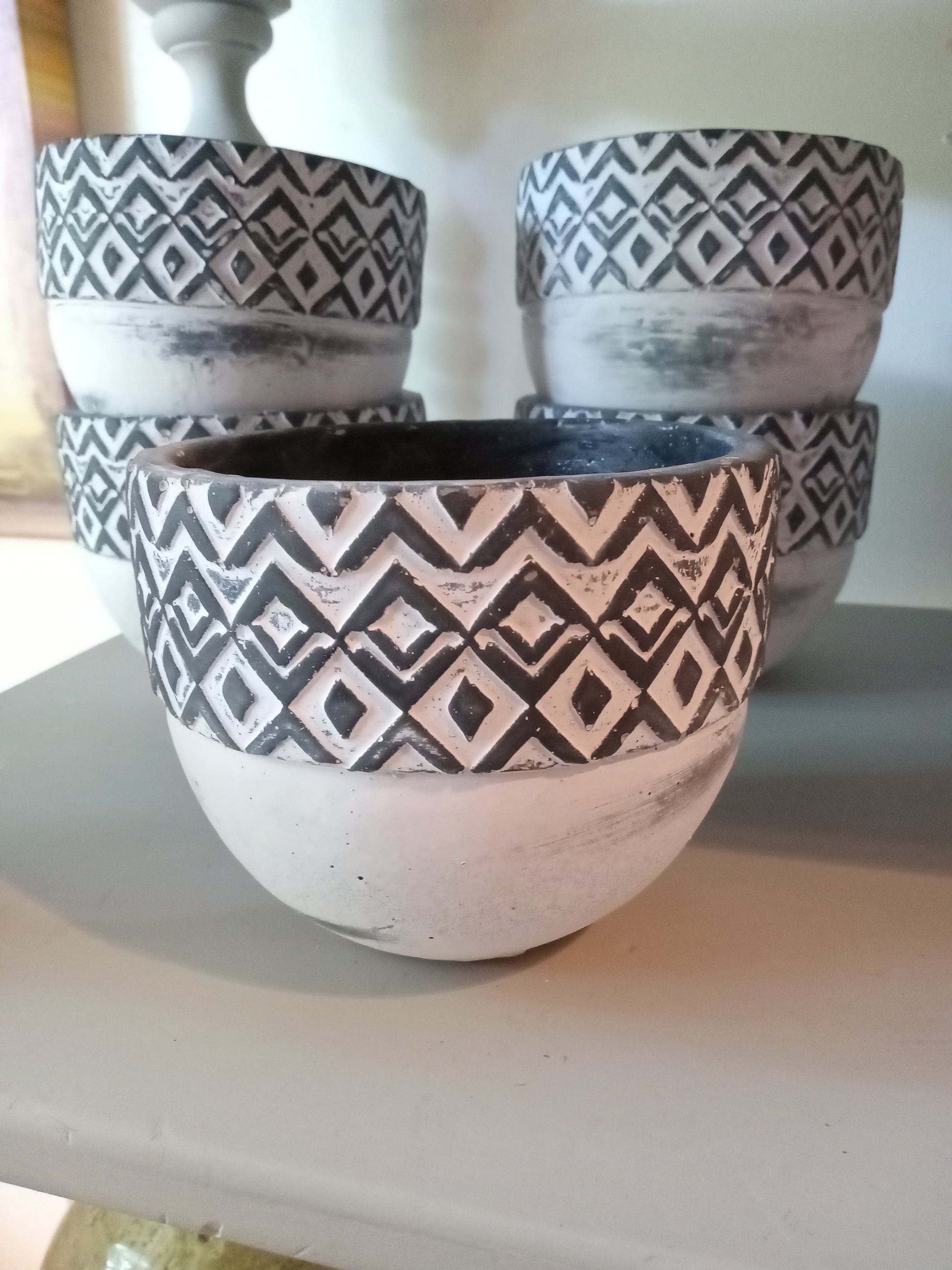 The perfect size for a succulent or small plant, this small black and white clay pot would look perfect in any setting!