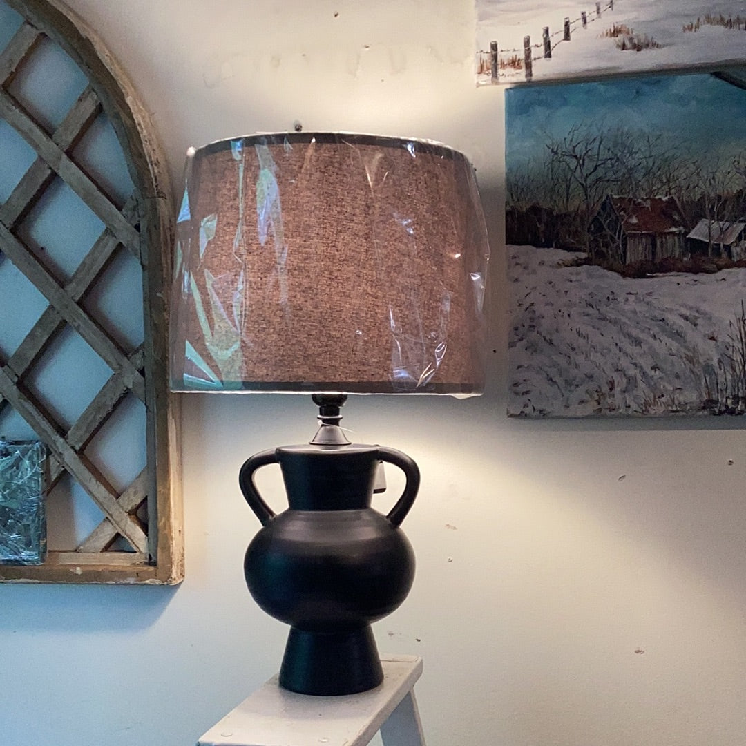 Beautiful black ceramic accent lamp with greige lamp shade. 20” tall.