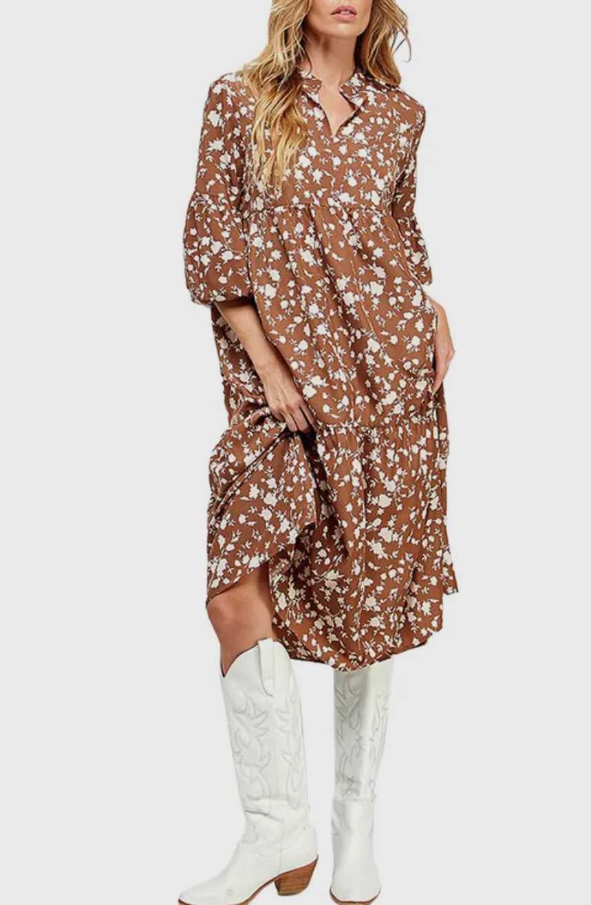 Brown & Cream Collar Floral Midi Dress