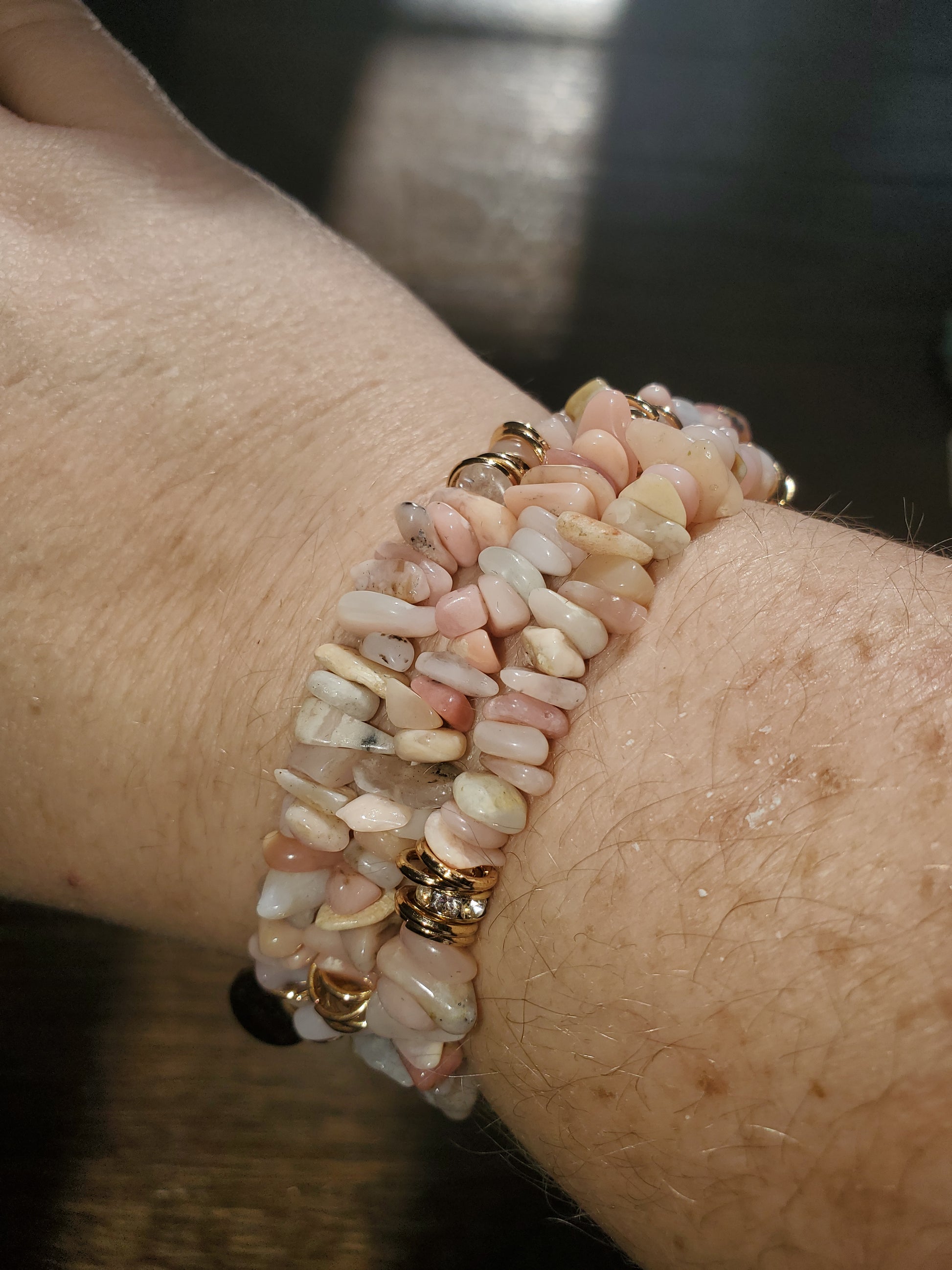 Set of theee bracelets made of beautiful natural flat pink stones with gold & crystal details. From the Stacked Collection by Kinsley Armelle