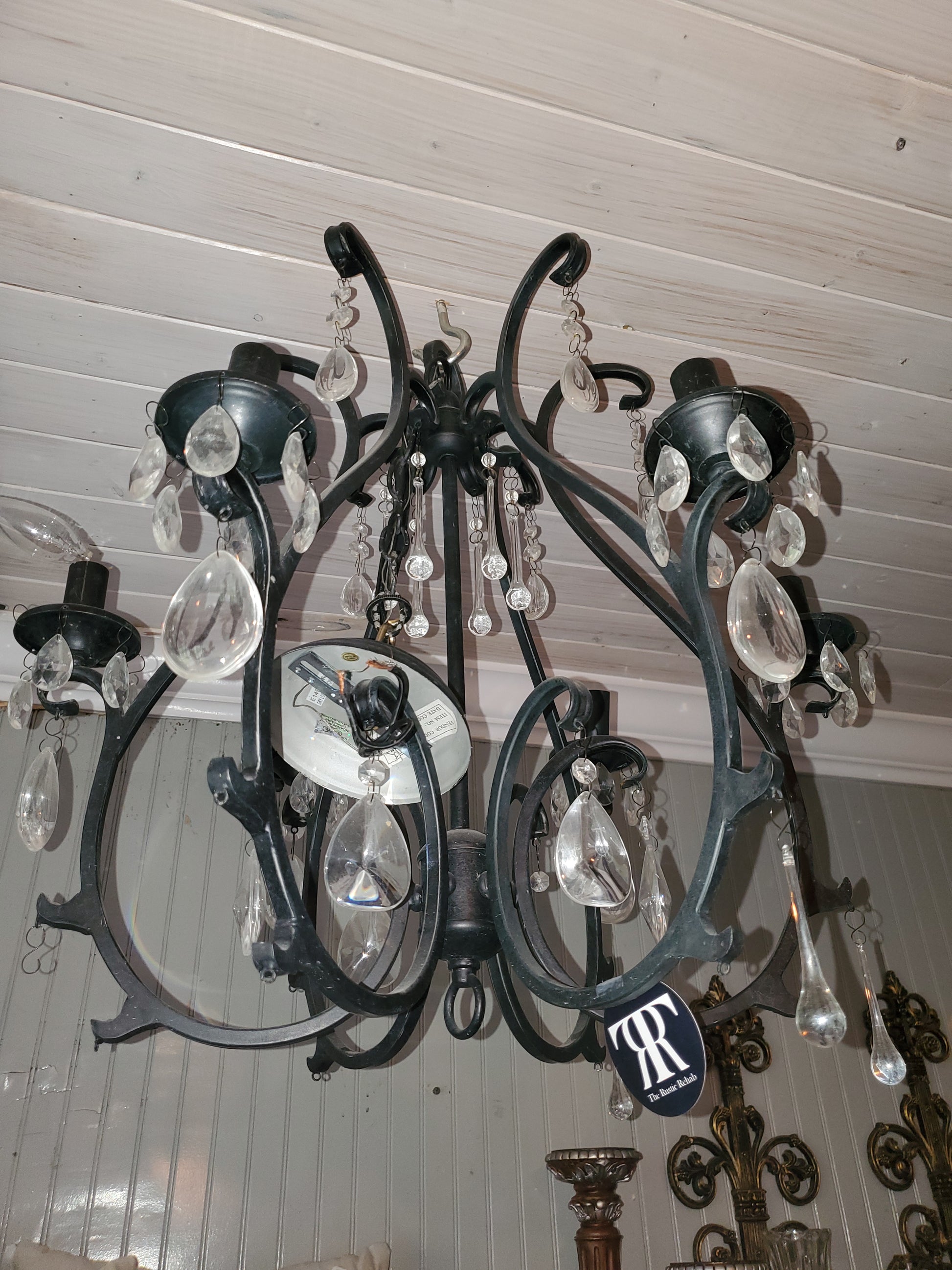 Large metal chandelier with matte black finish. Beautiful hanging crystals catch the light to give it an elegant flair.