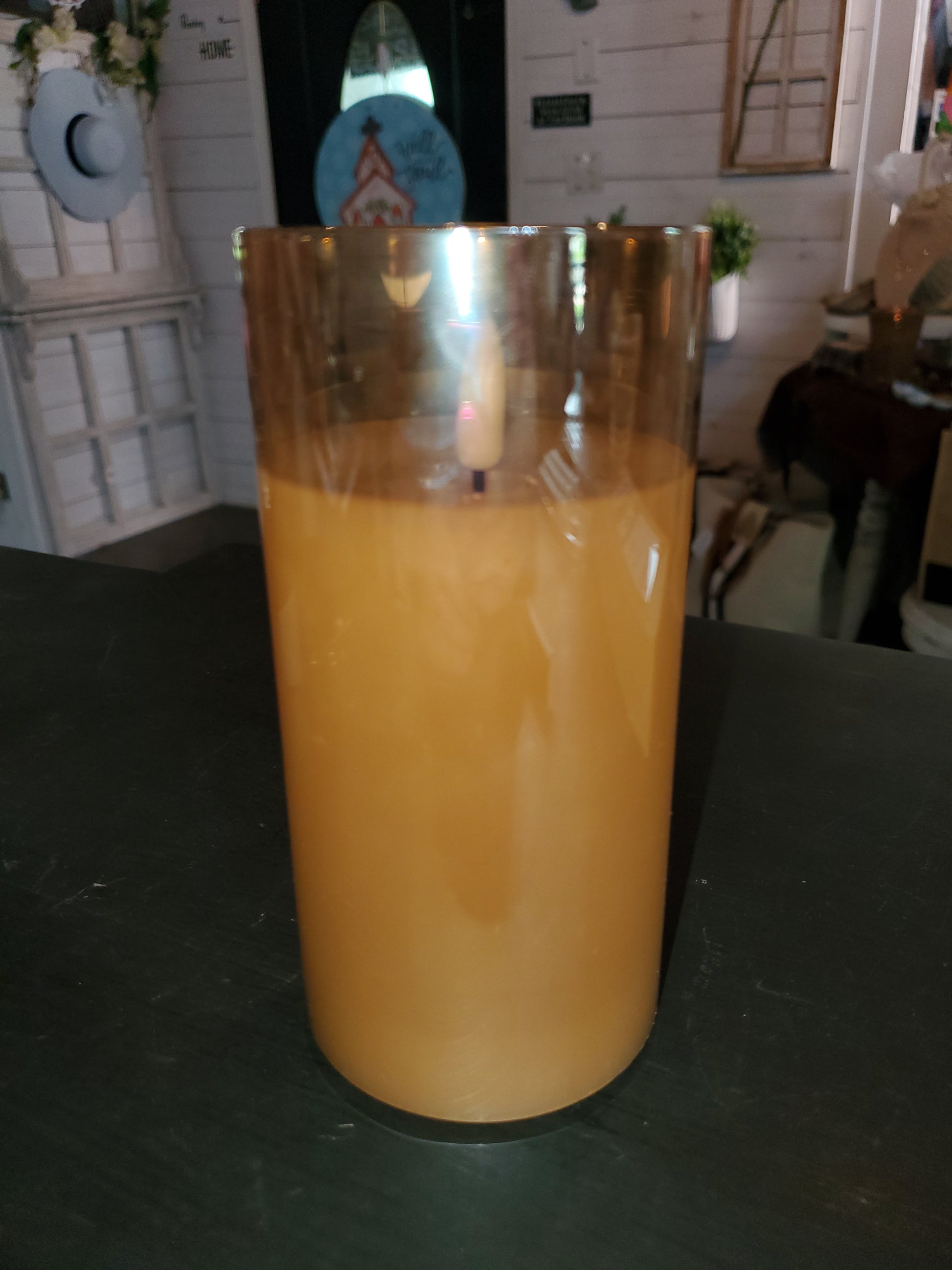 Single 6" flameless pillar candle with amber hurricane glass. Comes with timer & remote.