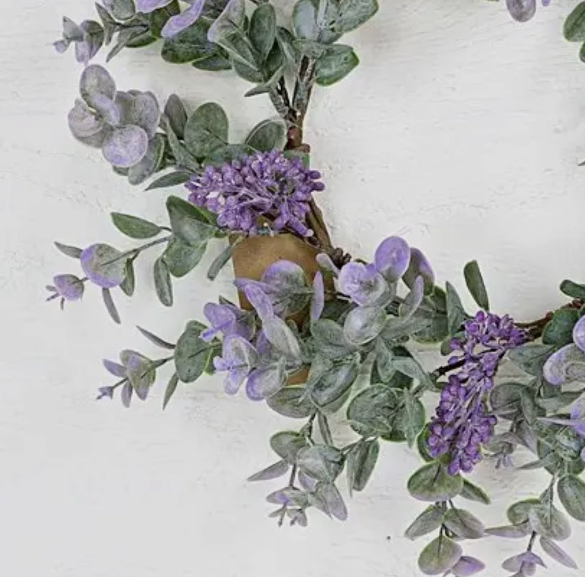 Faux floral lavender-colored eucalyptus. Can be used as a small wreath or large candle ring. 14"