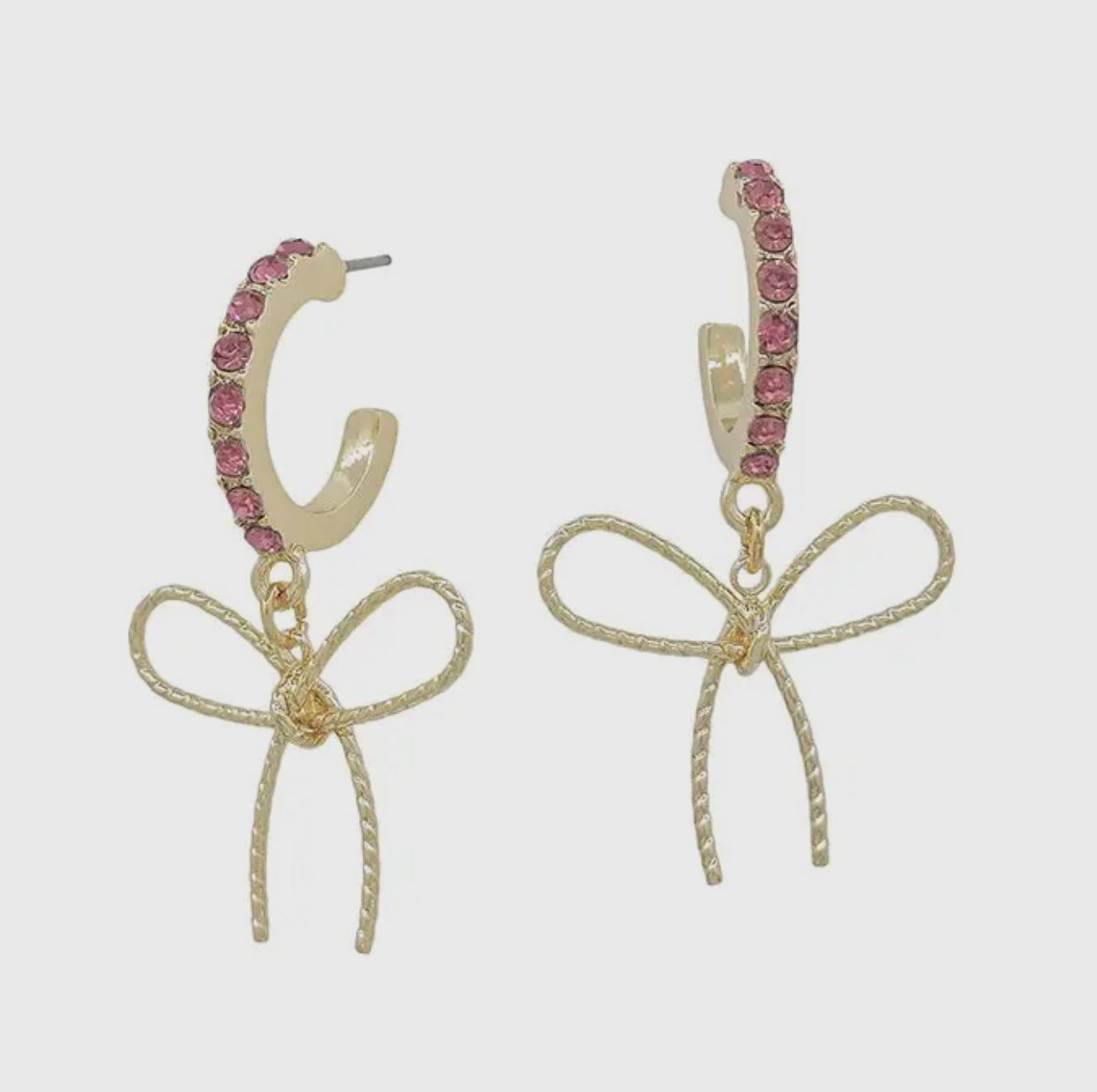 Pink Rhinestone Huggie Hoop with Gold Bow Earrings