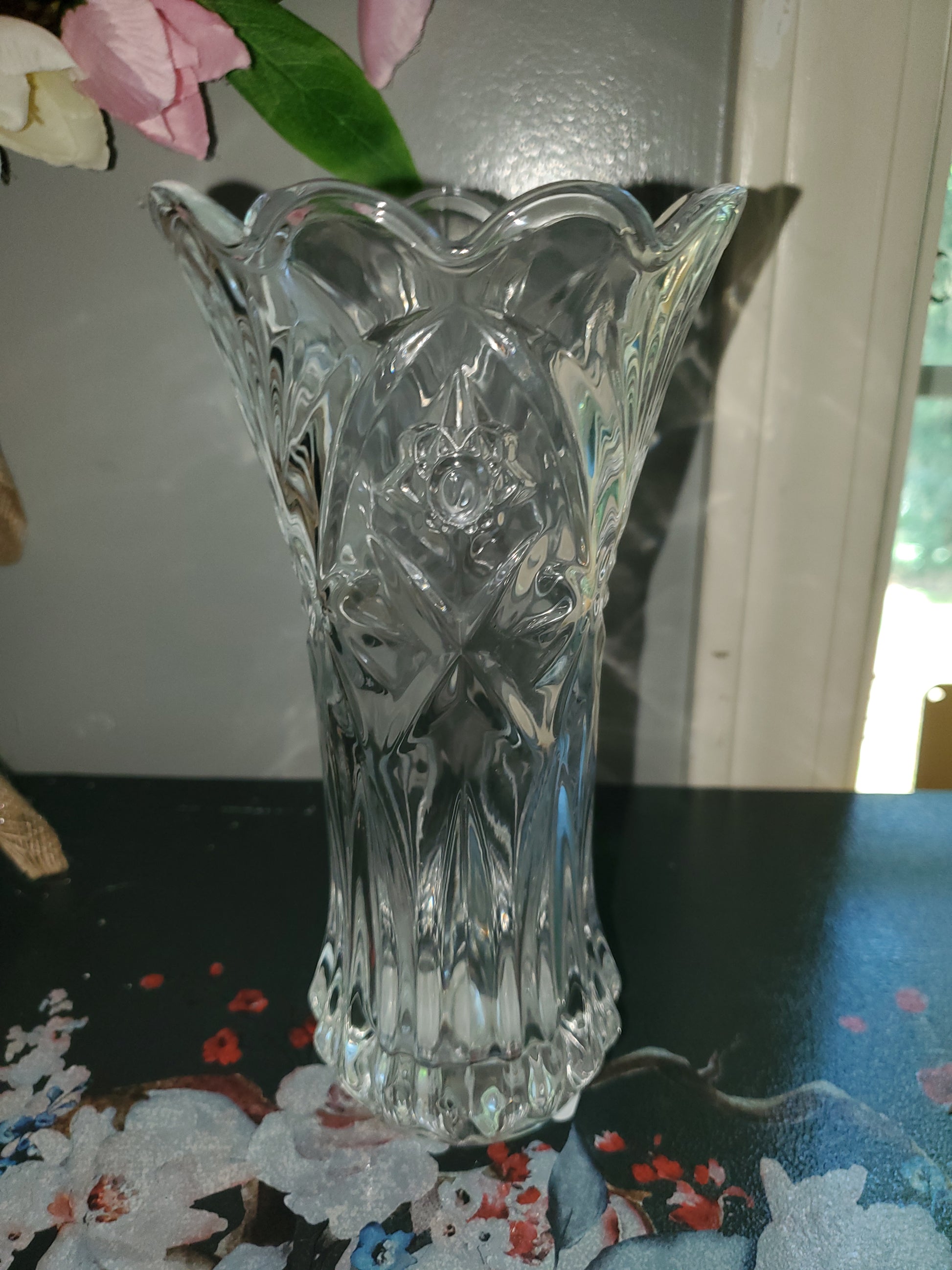 Clear cut glass vase with scalloped edging on top. 7.5” in height.