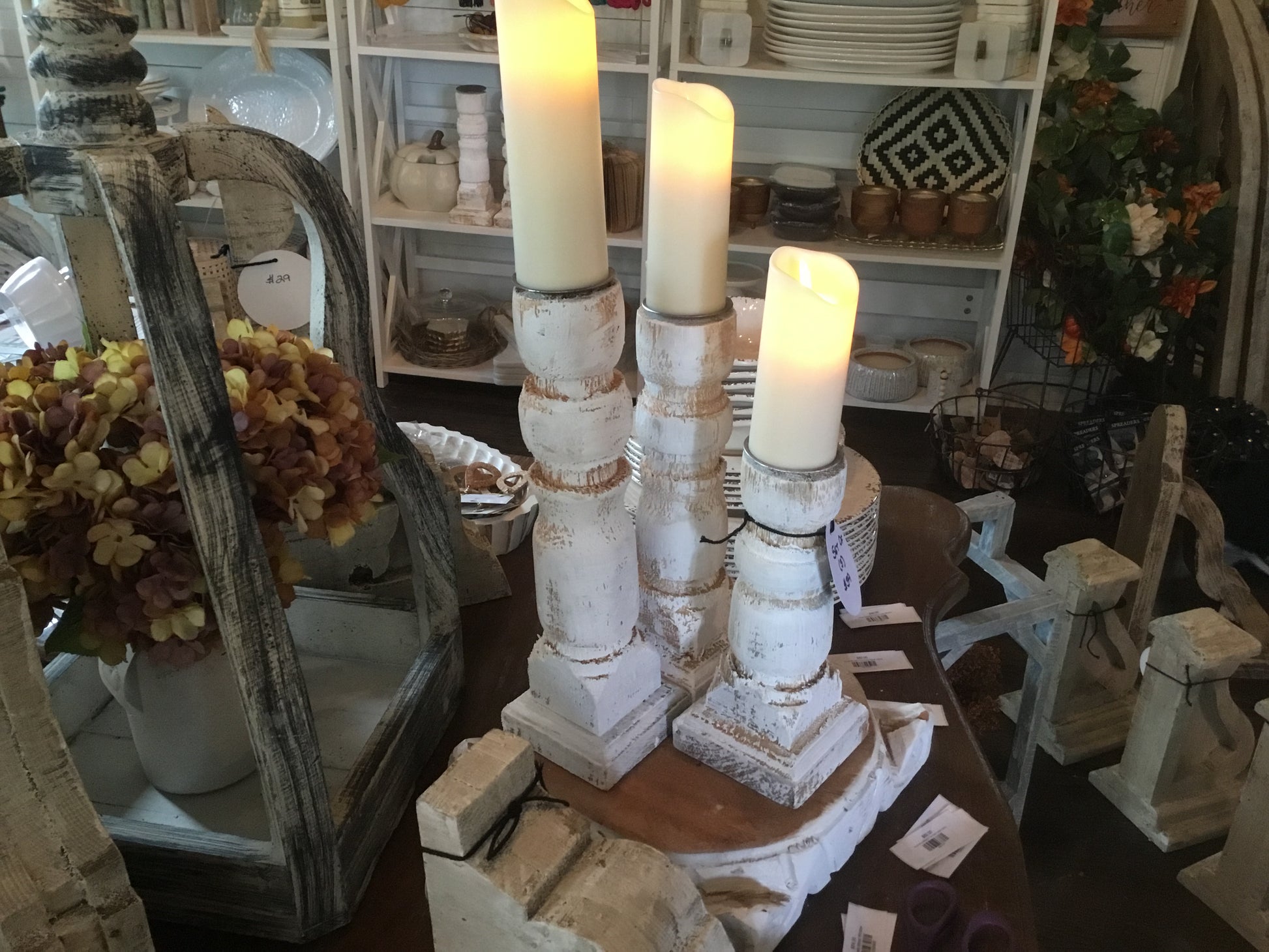 These beautiful distressed white candle holders are perfect for any room of your home. The set of 3 includes one of each size. 14”, 12” and 9 1/2” in height.
