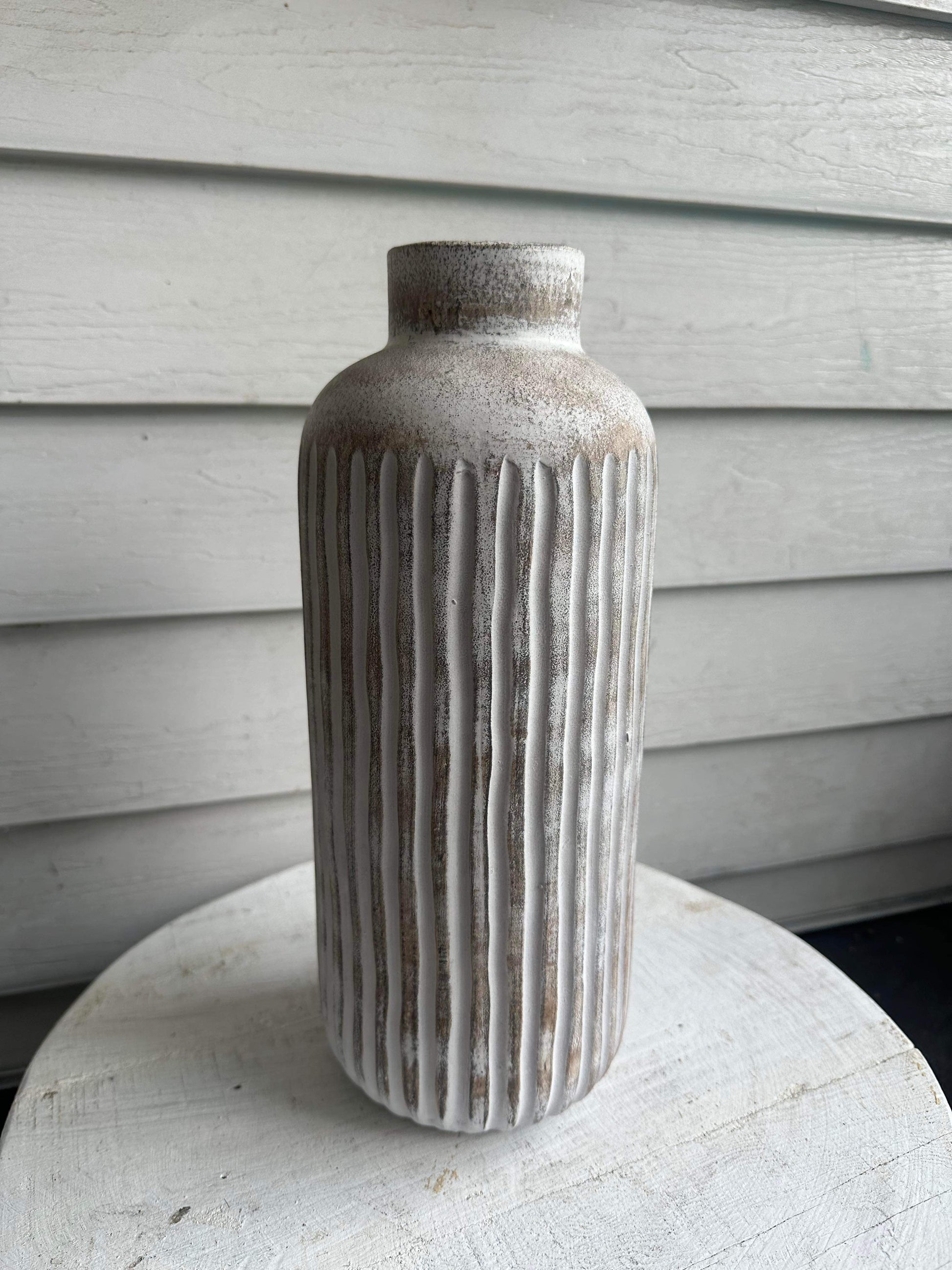 12" tall whitewashed ceramic vase with vertical stripe texture
