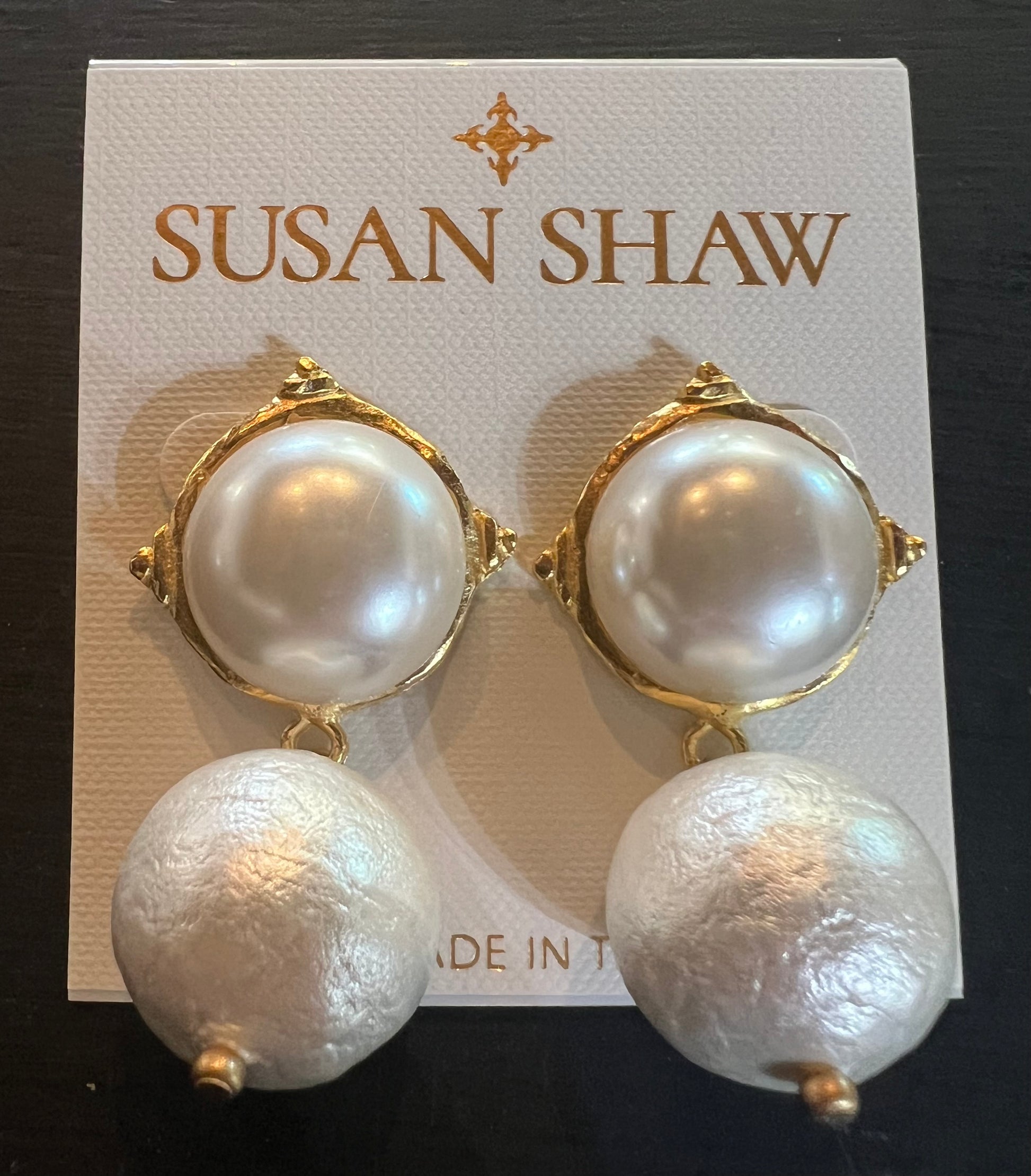 Beautiful gold pearl cab earrings with large cotton pearl drops.