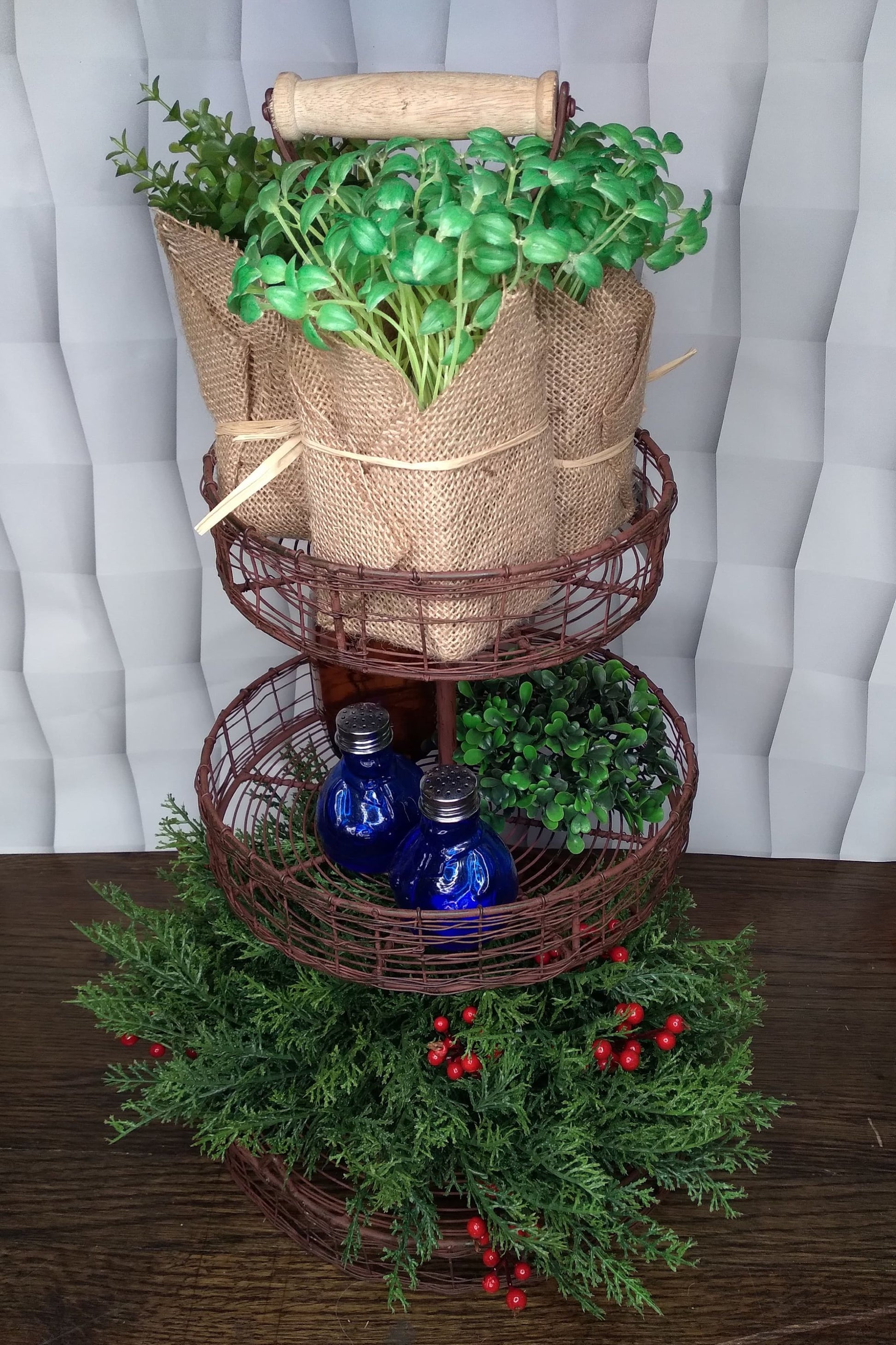 This beautiful three-tiered wire basket tray makes the perfect centerpiece in any setting!