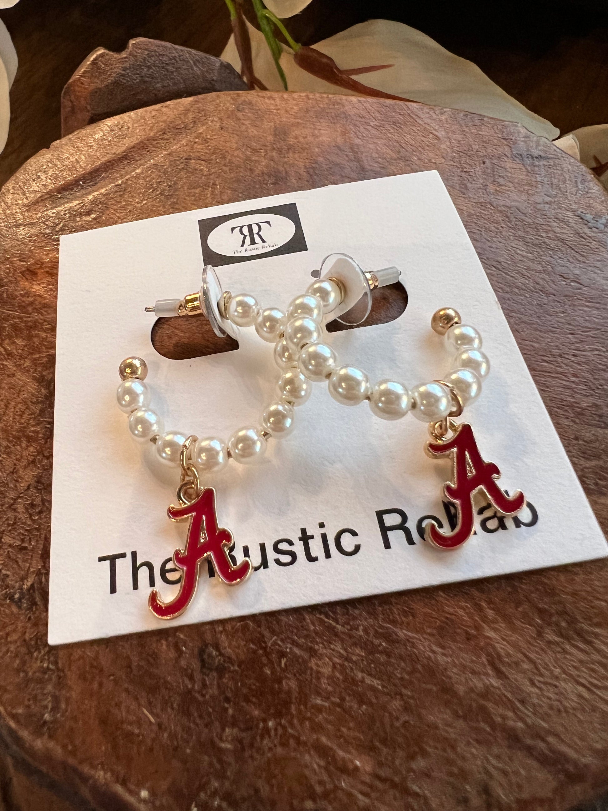 Alabama Crimson Tide medium pearl hoop earrings with dangle Script A